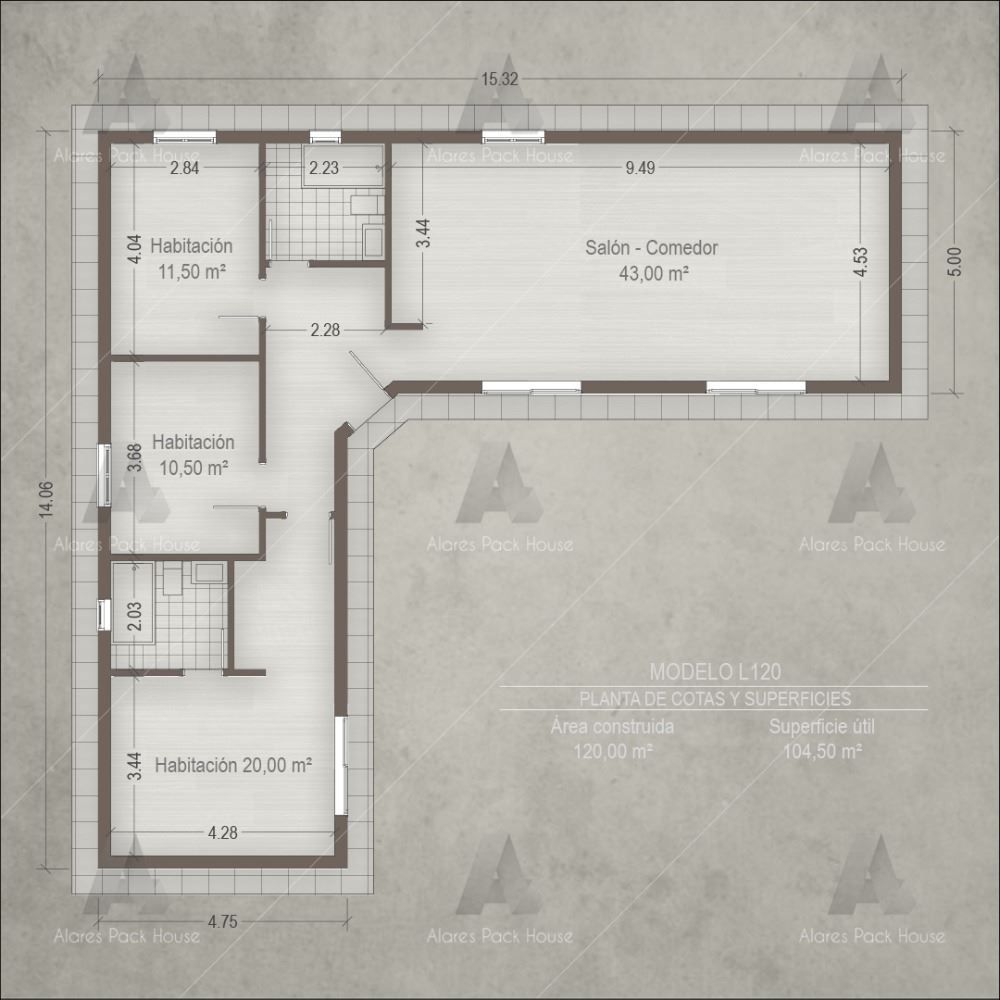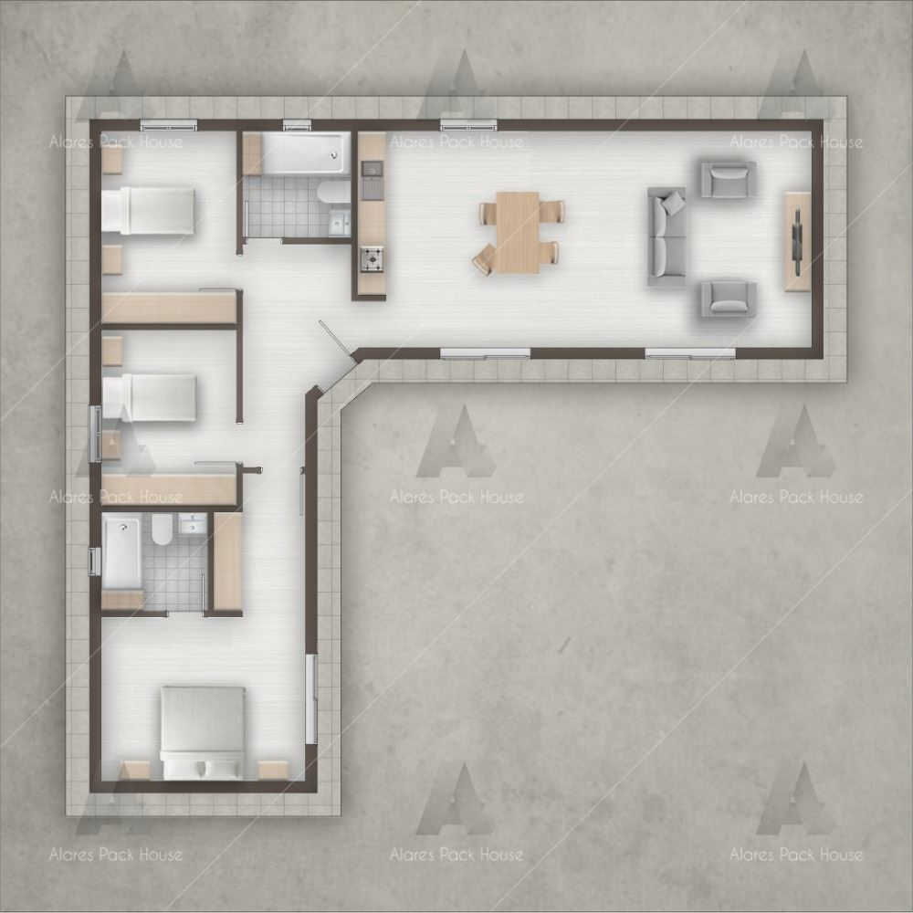 Kit estructural para el montaje de vivienda modular de cubierta plana y superficie construida 120 m2 con distribución interior de tres dormitorios, cocina y dos aseos.